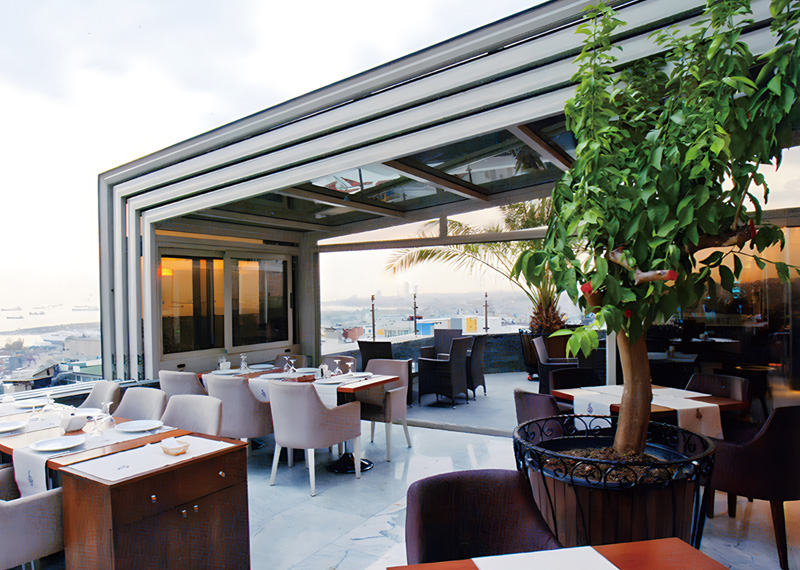 OpenAire®单坡式平移阳光房是搭接在已有建筑的侧边,与原有建筑浑然一体;关闭后增加了一个阳光空间,开启后又不占地方,灵活美观。适用于餐厅、咖啡厅、会议中心、住宅露台和游泳池。